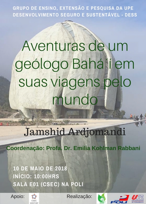 Dia 10 de maio de 2018 teremos a presença de Sr. Jamshid Ardjomandi, geólogo Bahá´í, na POLI as 10 hrs na Sala E01 (CSEC). Sr. Ardjomandi serviu muitos anos como membro do Corpo Auxiliar na América do Sul e na Assembléia Espiritual Nacional do Suriname, e nas últimas décadas serviu como Coordenador dos Lugares Sagrados na Terra Santa em Israel. Será uma excelente oportunidade de conhecer um pouco de sua história de vida.